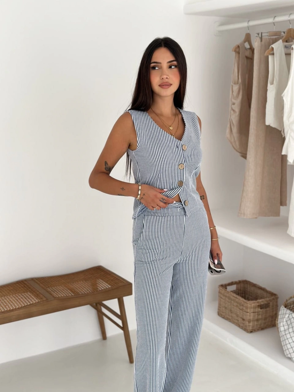 Modaskop Gri Su Yolu Yelekli İkili Takım, şıklığı ve tarzıyla kombinlerinizi tamamlar.