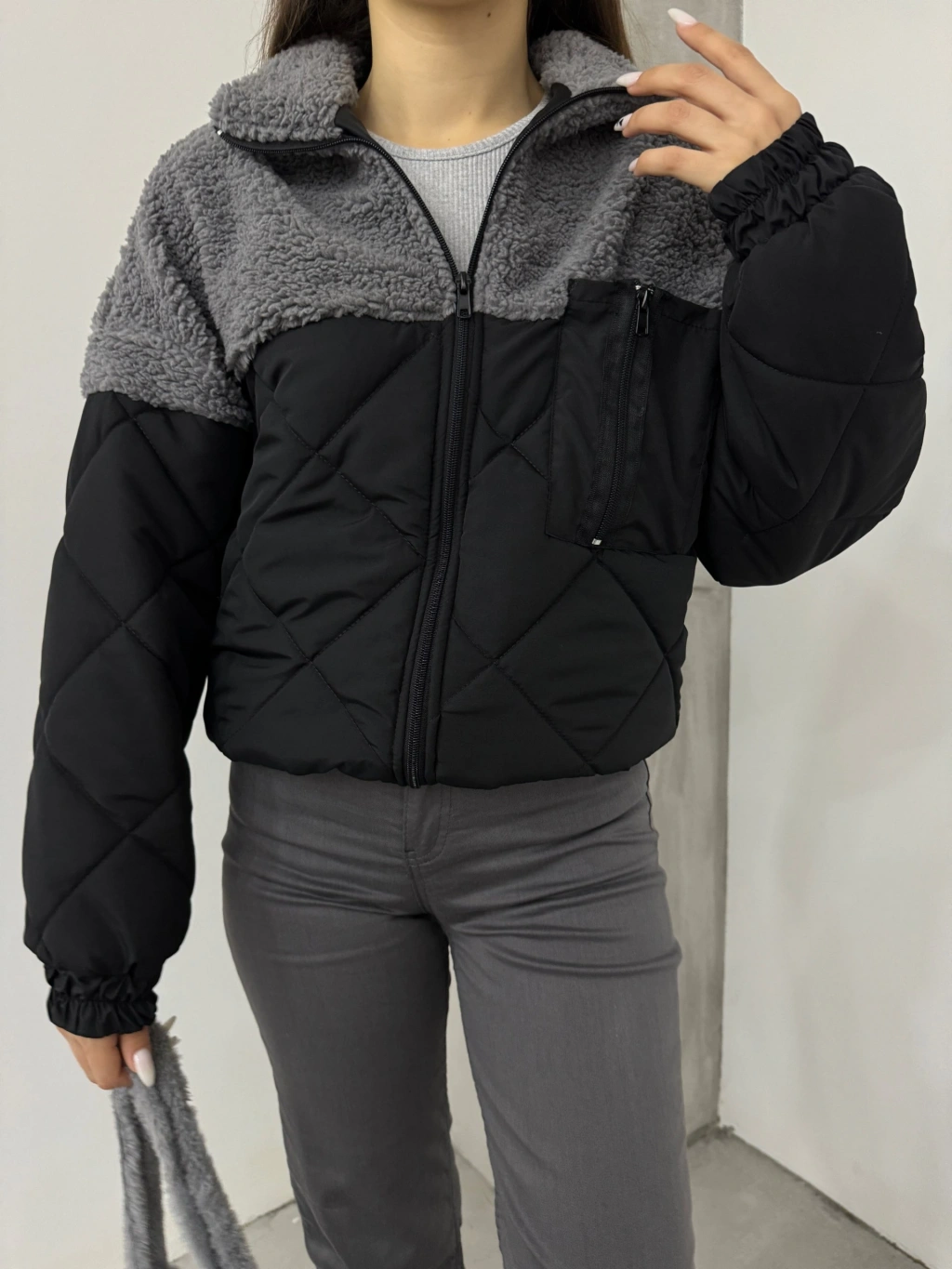 Gri Kapitone İçi Astarlı Kürklü Mont