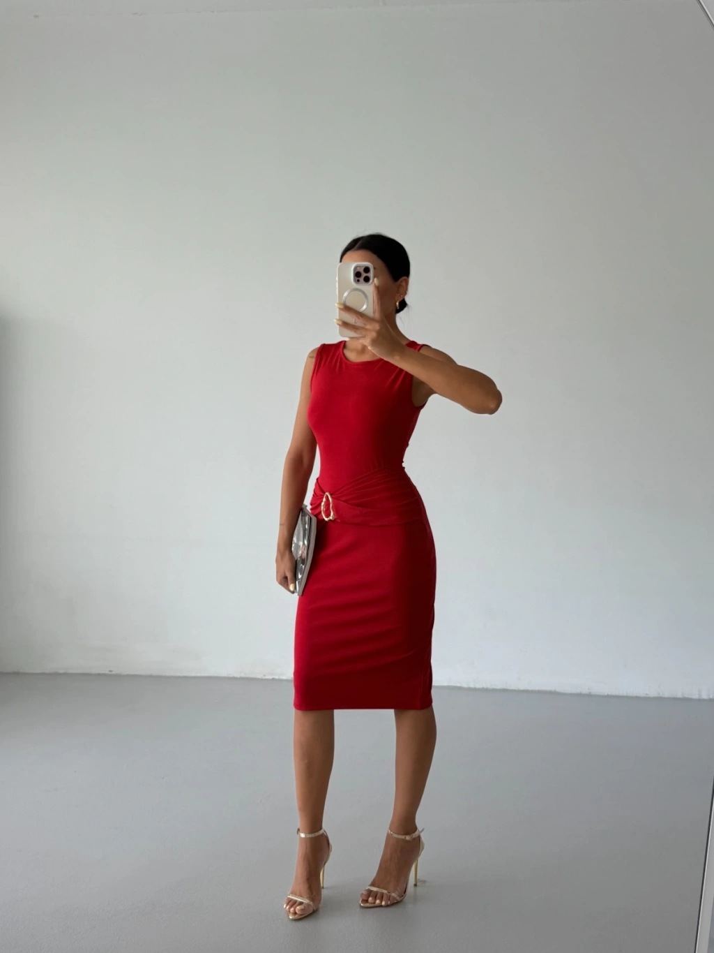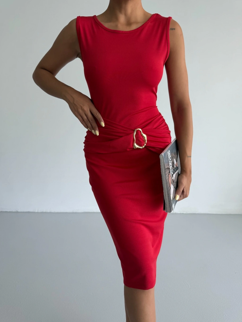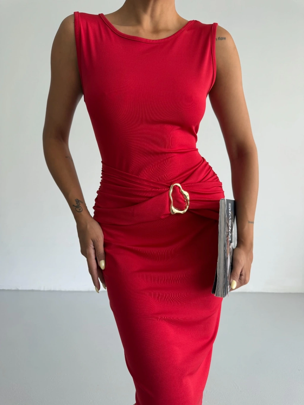 Kırmızı Toka Detay Midi Boy Dalgıç Elbise