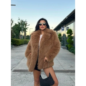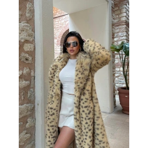 Sarı Leopar Ceket Yaka İçi Satarlı Uzun Kürk Kaban