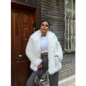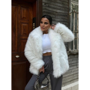 Beyaz Leopar Ceket Yaka İçi Satarlı Uzun İthal Kürk Kaban