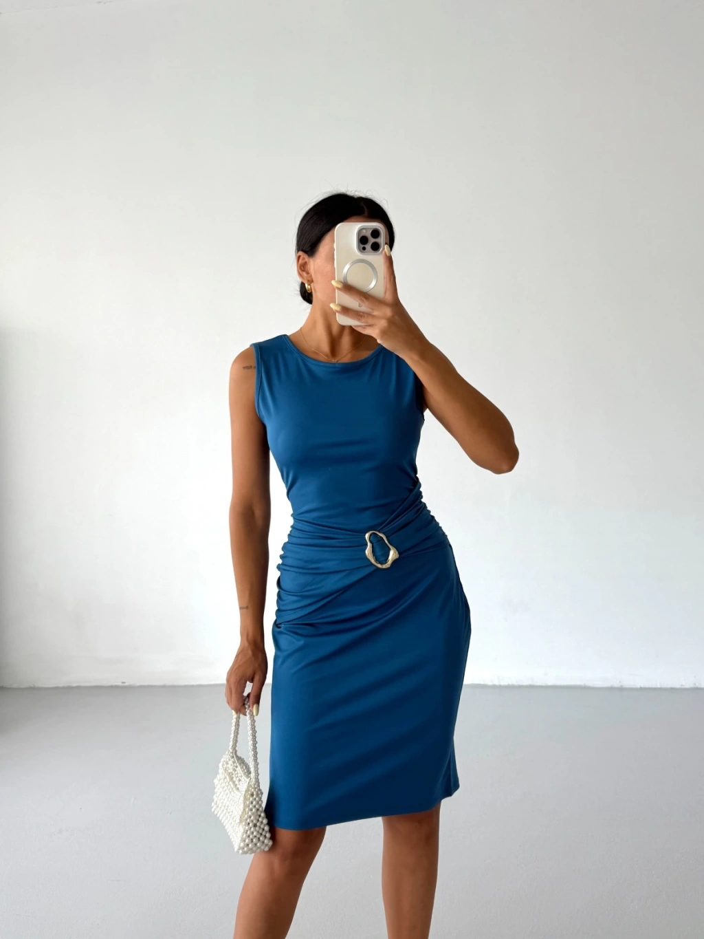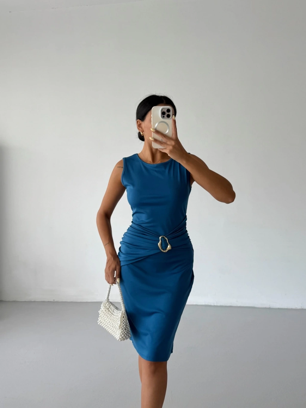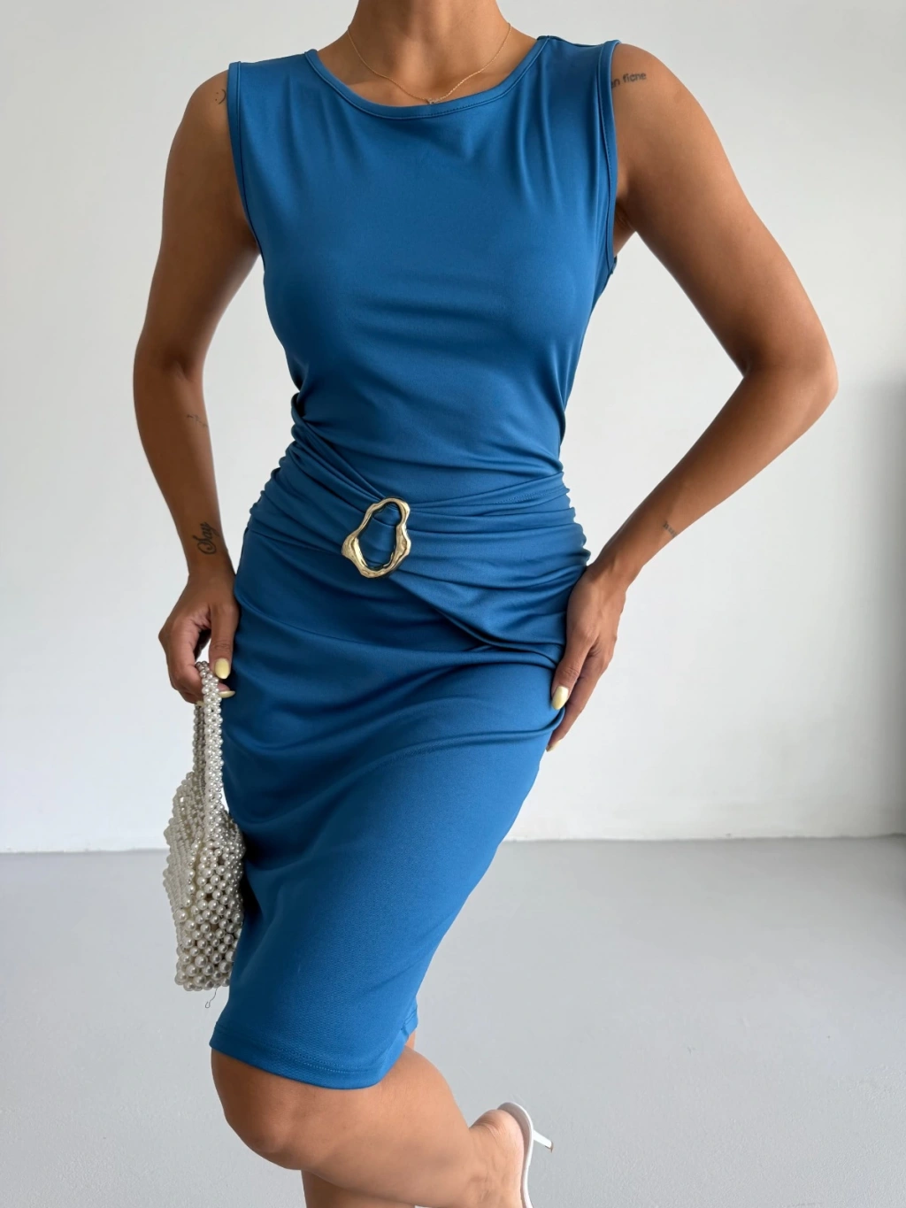 Sax mavi tokalı detaylarıyla şık ve feminen bir görünüm sunan midi boy dalgıç elbise.