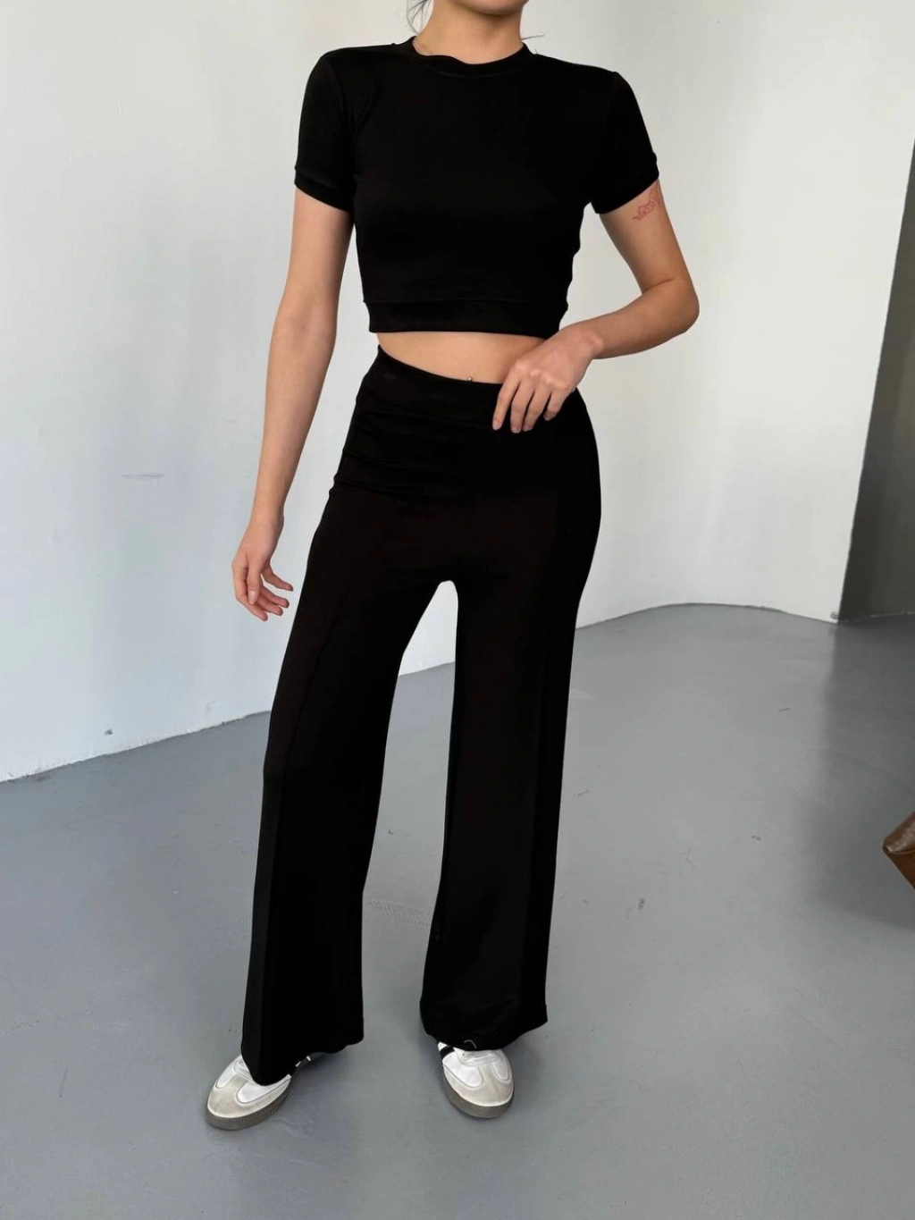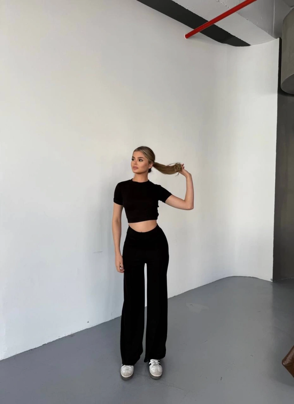 Modaskop Siyah Oysho Modal İkili Crop Takım, rahatlığı ve şıklığı bir arada sunar.