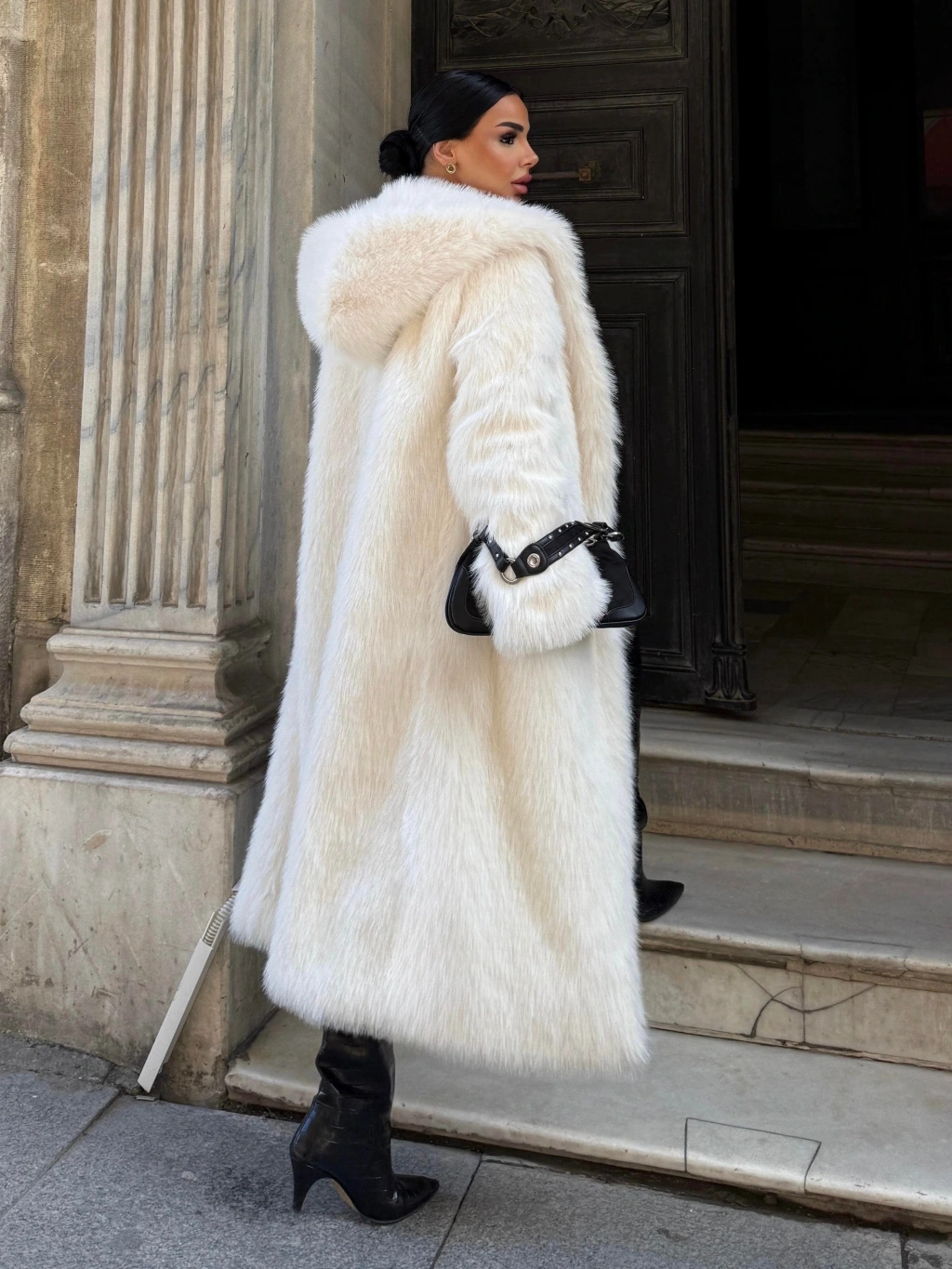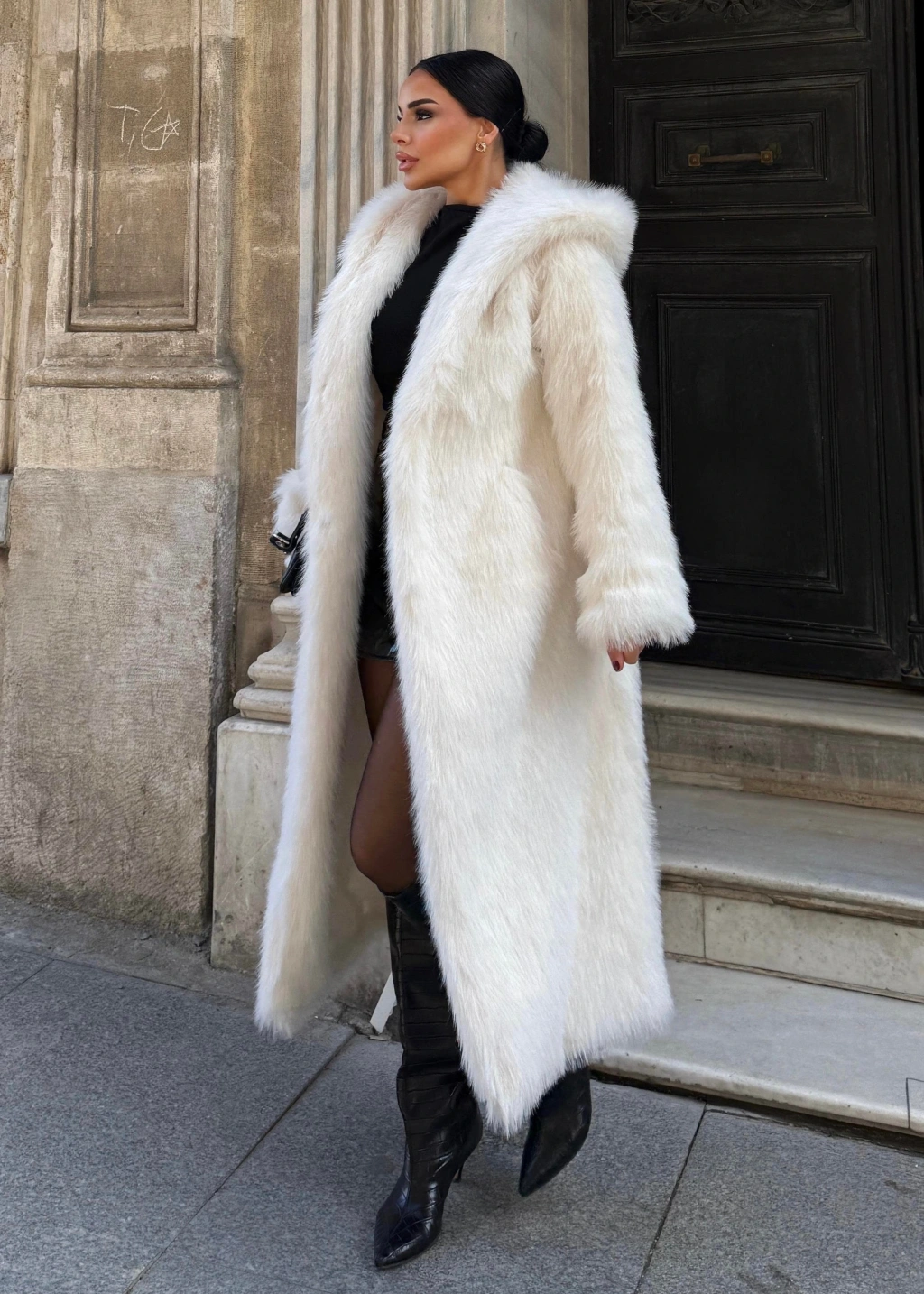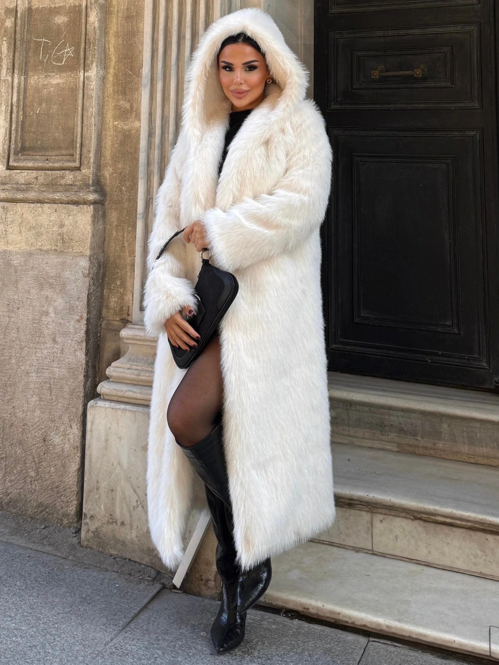 Beyaz Kapşonlu Uzun İthal Kürk