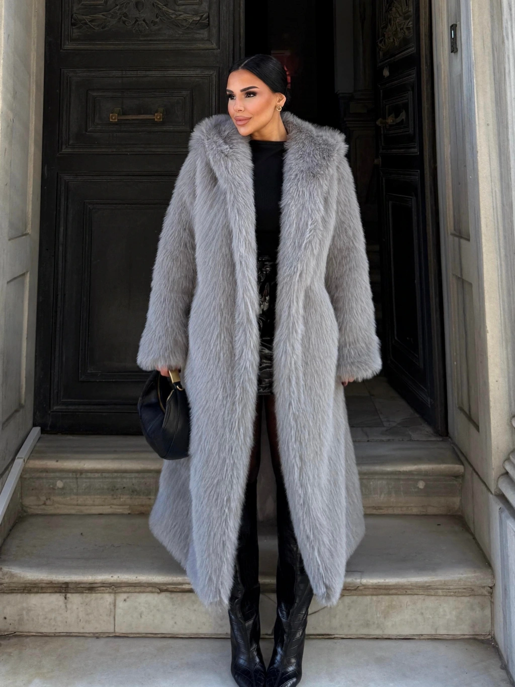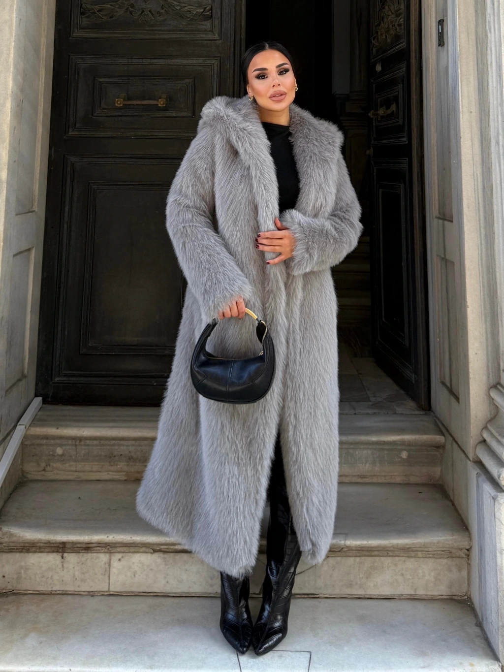 Gri Kapşonlu Uzun İthal Kürk