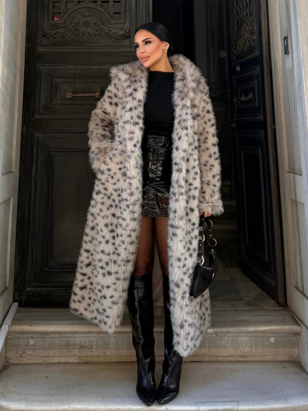Gri Leopar Kapşonlu Uzun İthal Kürk