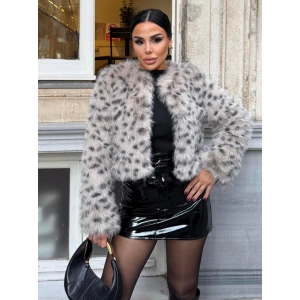Gri Leopar Düz Yaka Crop İthal Kürk