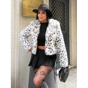 Beyaz Leopar Düz Yaka Crop İthal Kürk