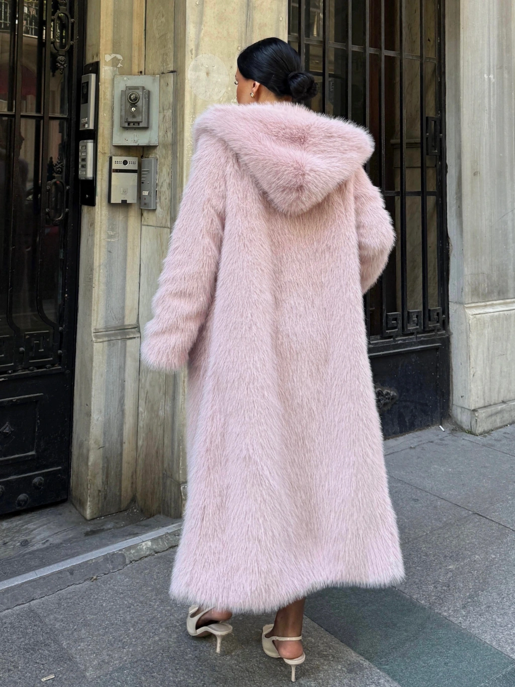 Pudra Kapşonlu İçi Astarlı Rabbit Peluş Kaban