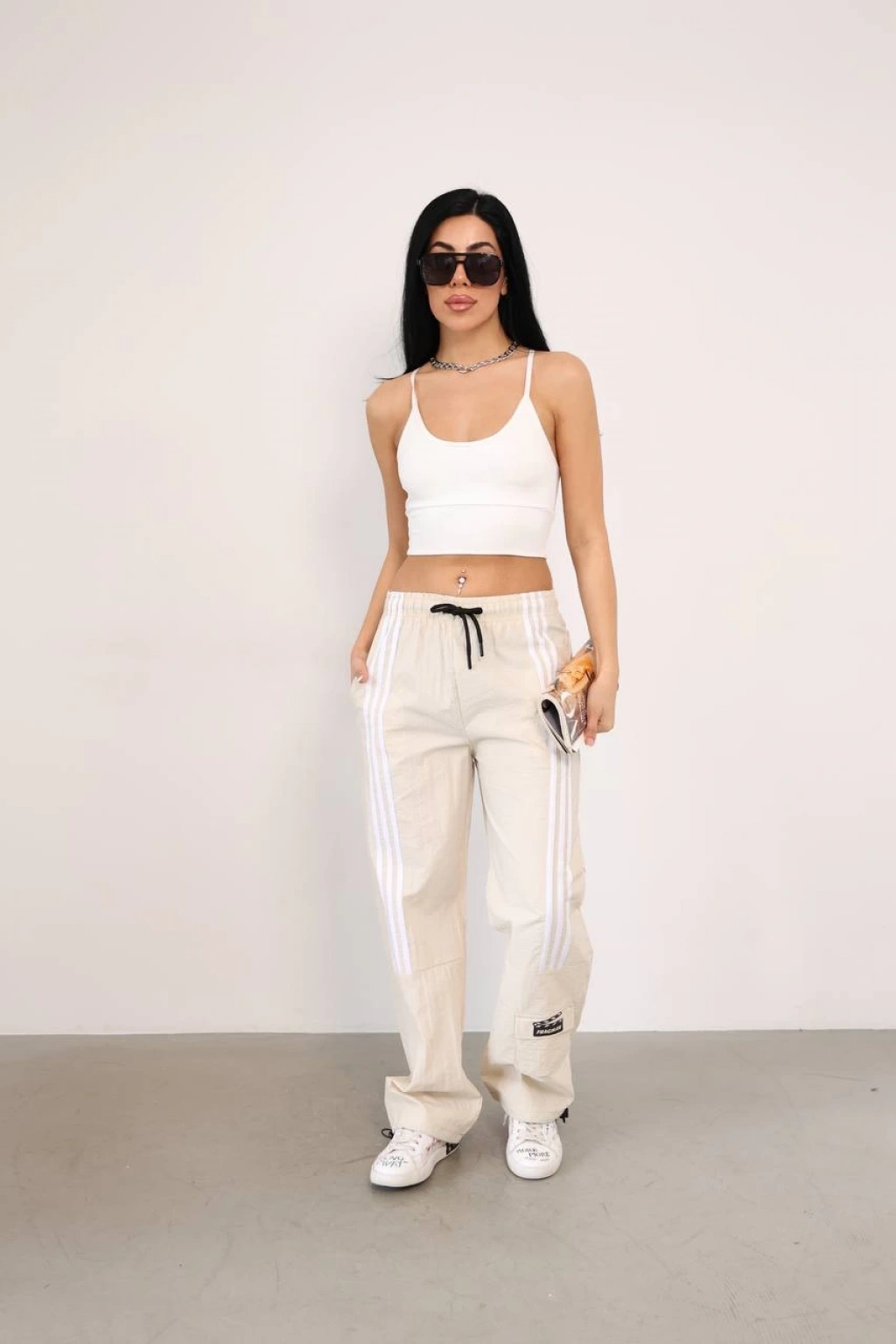 Modaskop Paraşüt Eşofman: Rahatlığı ve şıklığı bir arada sunan krem renkli eşofman altı, önden üç şerit detayı ve paça cebiyle dikkat çekiyor.
