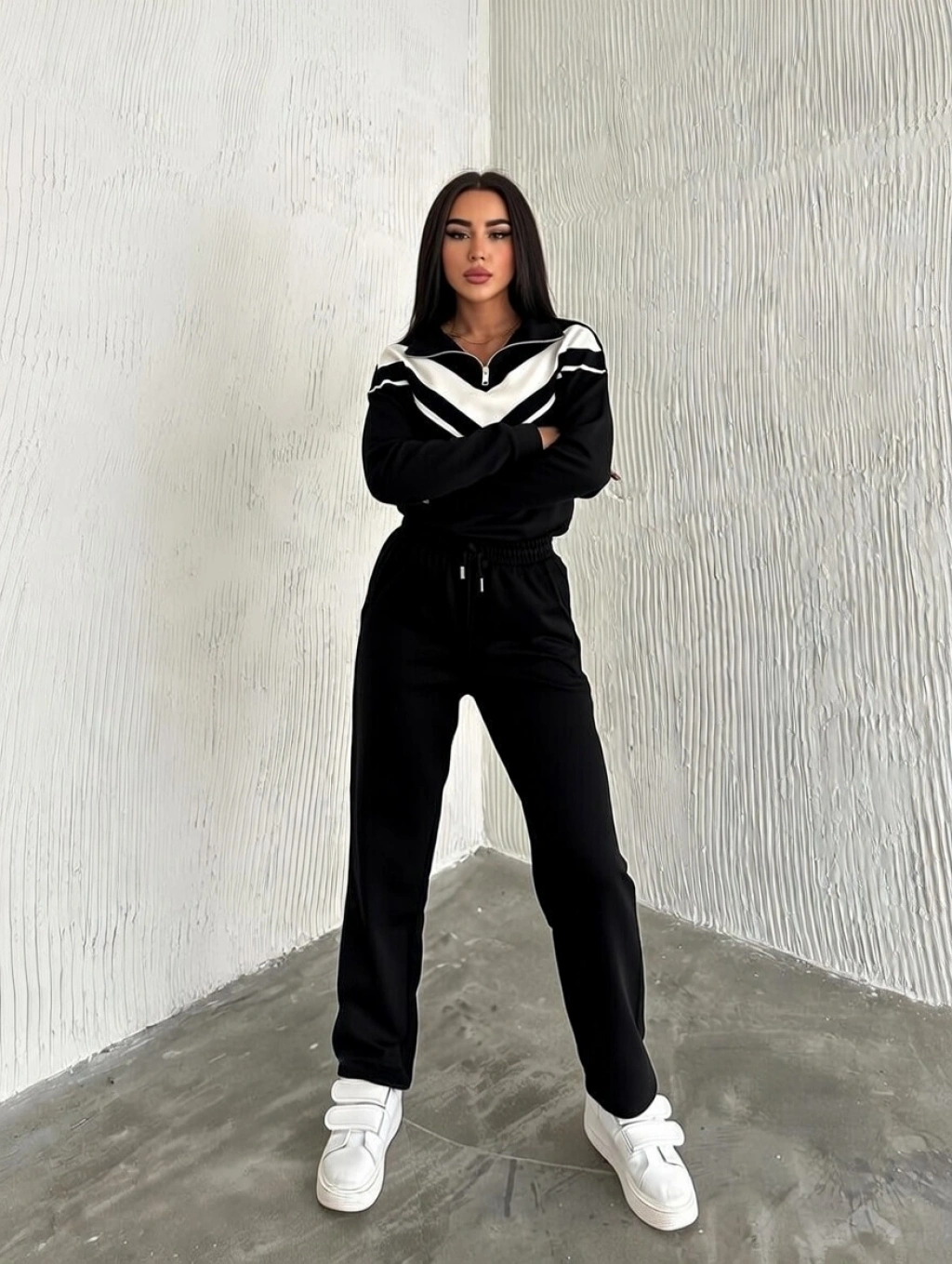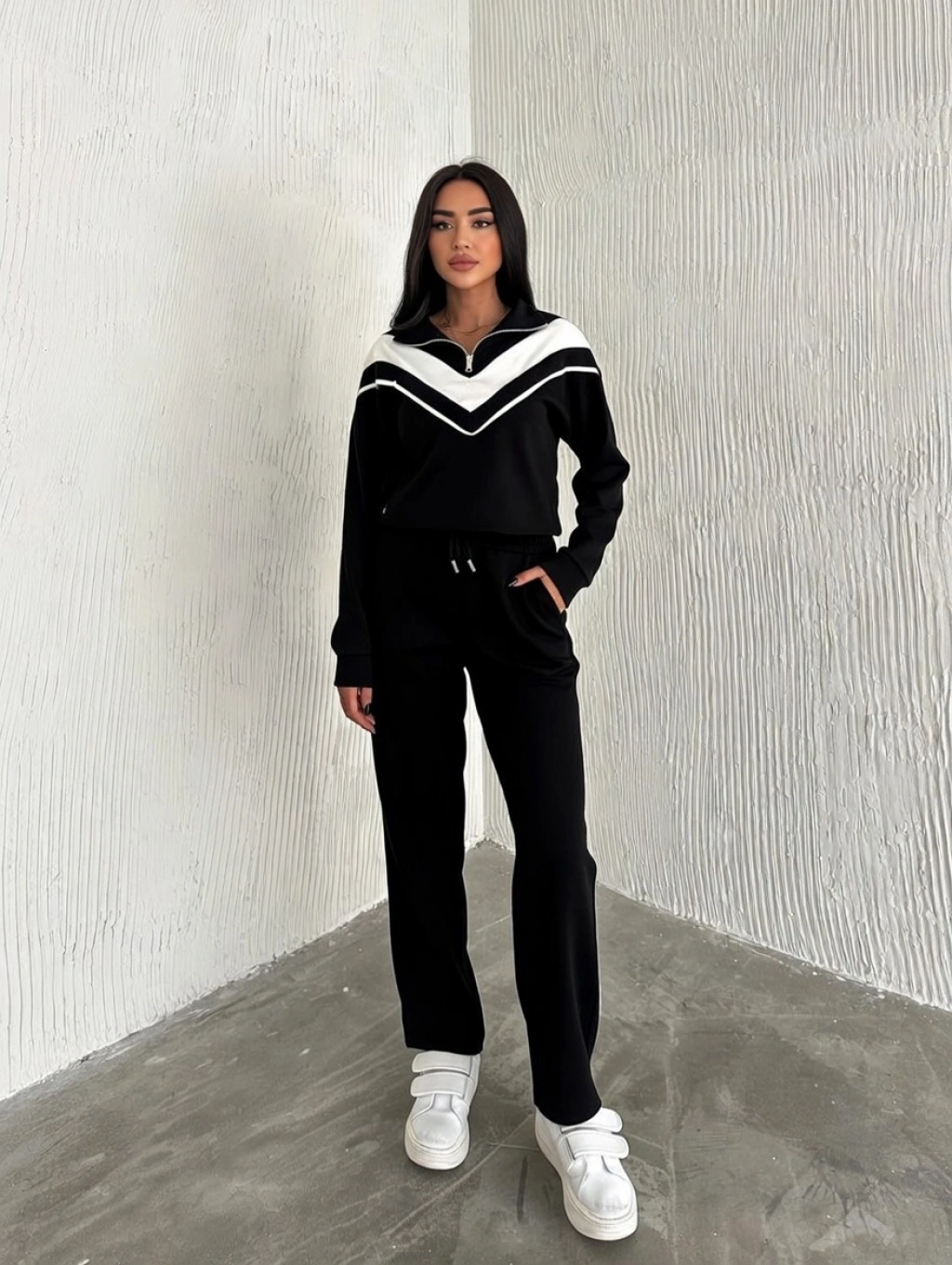 Modaskop Siyah Şardonlu Modal Garnili Eşofman Takımı, şıklığı ve rahatlığı bir arada sunar.