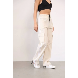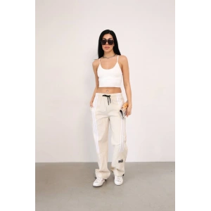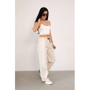Krem Önden Üç Şerit Paça Cep Detay Paraşüt Eşofman