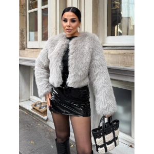Gri Leopar Düz Yaka Crop İthal Kürk