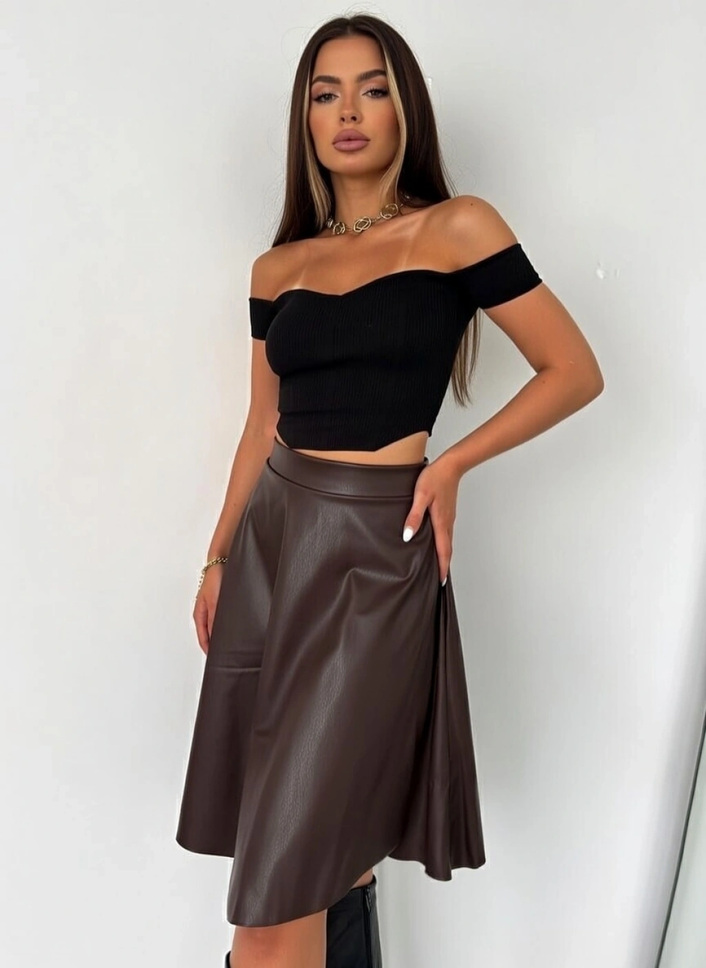 Taba Deri Kloş Etek SIZE: S-M-L-XL Kumaş: Deri Kumaş Manken Ölçüleri: Boy:169 Cm Kilo: 55 Kg. Manken Bedeni: S (36) Beden