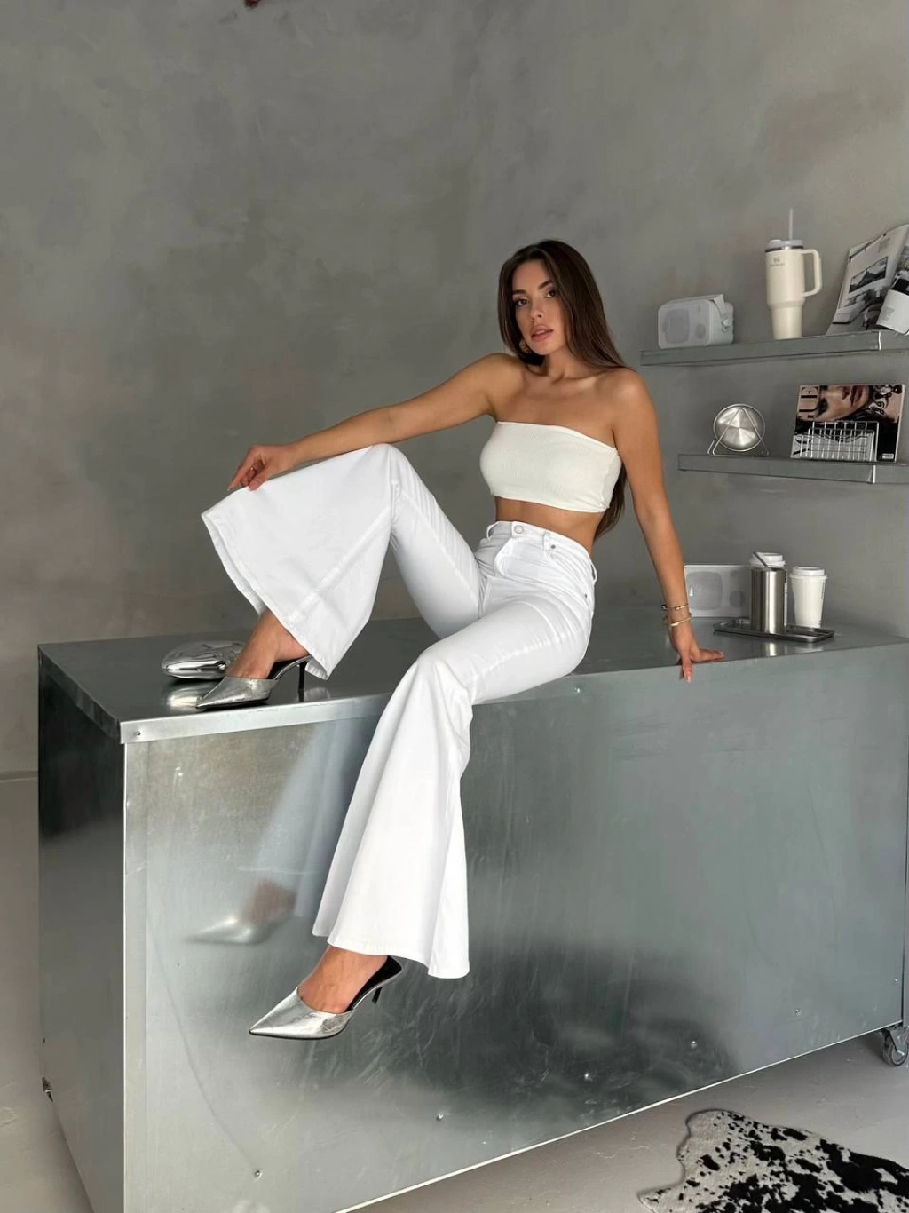 Beyaz İspanyol Paça Likralı Kot Pantolon
